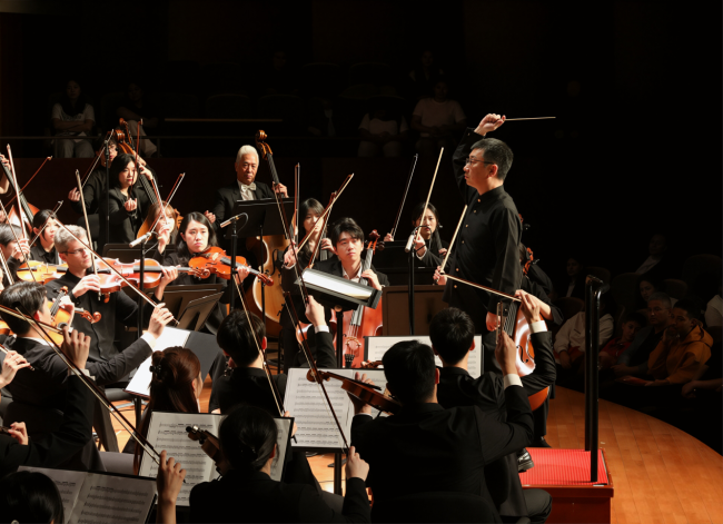 同时,音乐会还上演了熊小玉教授创作的管弦乐《井冈颂》。该作品以序曲体裁、双管编制,运用江西革命音乐素材进行主题创作,通过变奏、对位、调性变化等手法细腻铺陈,以同样浓郁的赣鄱红色音乐语汇,抒发了对井冈山精神的深情礼赞。