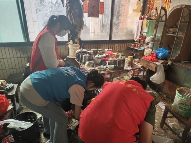 以“安”除患,精准整治居家风险针对部分老人物品囤积、消防通道堵塞、易燃物集中等安全隐患,社工站联动越秀区解放路消防救援站、爱心企业组建“平安小组”,采用“认知引导+行为干预”模式,入户宣讲、心理疏导、正向激励,推动老人从“被动清理”转向“主动维护”。社工与志愿者协同入户排查隐患、清理杂物、规整空间。目前已完成20户高风险家庭排查,15户重点个案深度干预,清理杂物百余袋,规整安全空间超80平方米。