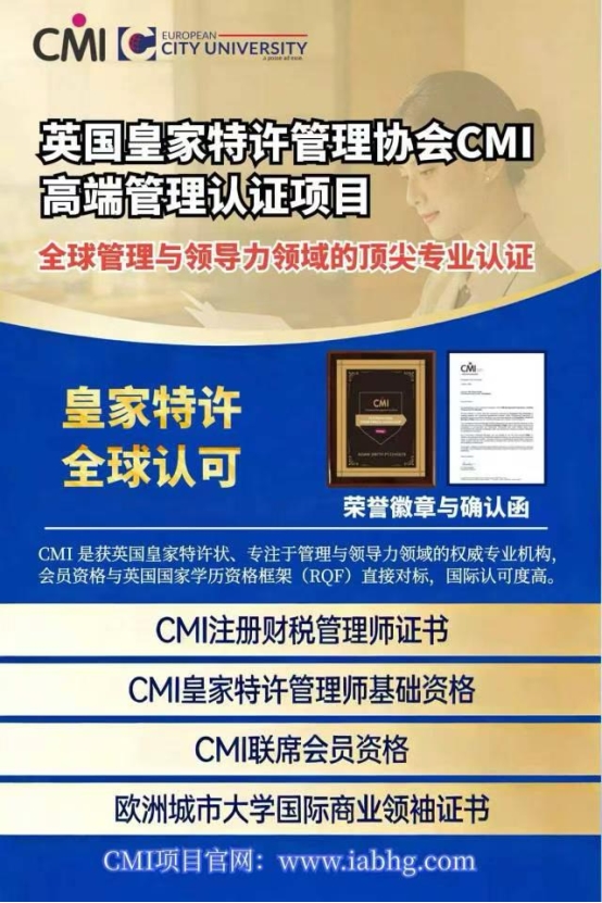 除了为ICPA持证人提供专属绿色通道的精准赋能,为进一步拓宽全体学员的职业发展路径、提升国际认可度,欧洲城市大学同步与英国皇家特许管理协会(CMI)达成深度战略合作伙伴关系,共同开展皇家特许管理师联合认证项目,为学员打造“学术学位+职业认证”的双重赋能优势,增强核心竞争力。作为全球极具影响力的管理领域权威机构,英国皇家特许管理协会(CMI)拥有超过70年的管理教育与认证经验,其颁发的皇家特许管理师资格证书,在全球150余个国家和地区获得广泛认可,更是管理者晋升、岗位竞聘的重要加分项。双方的联合认证实现深度融合,学员可获得CMI颁发的注册财税管理师证书+英国皇家特许管理师基础资格+CMI联席会员资格;同时,欧洲城市大学还将为学员颁发国际商业领袖(International Business Leader)专业证书,这是国际通用的能力佐证,含金量十足。