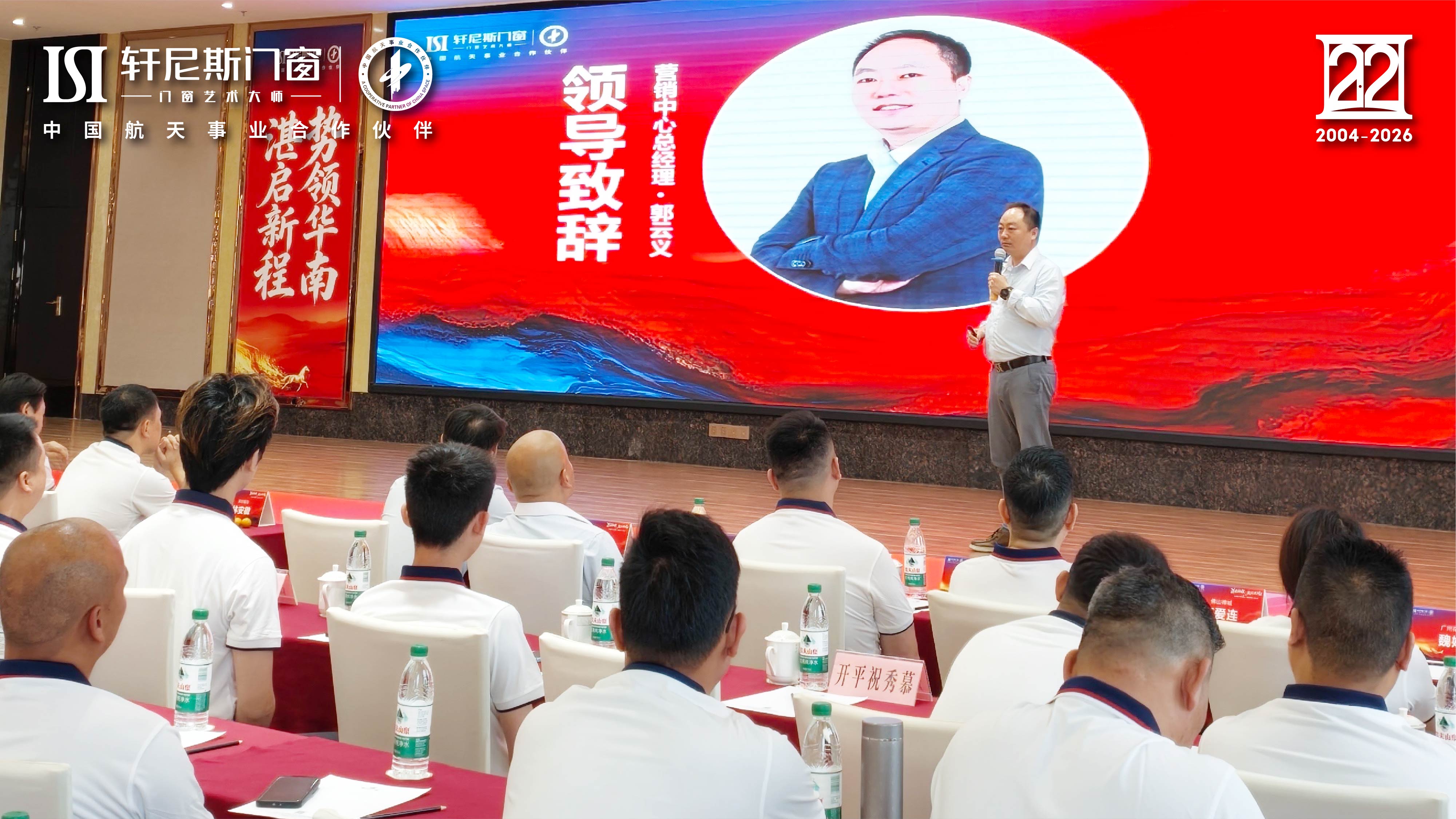 随后,轩尼斯门窗营销中心总经理郭云义先生(下称郭总)发表致辞,并深度解读了华南区域2026年度战略方向与核心增长路径。郭总强调,在消费升级与行业洗牌的双重背景下,轩尼斯门窗将坚定不移地深化“门窗艺术大师”的品牌定位,将门窗产品从功能性建材升级为塑造生活美学的艺术载体。