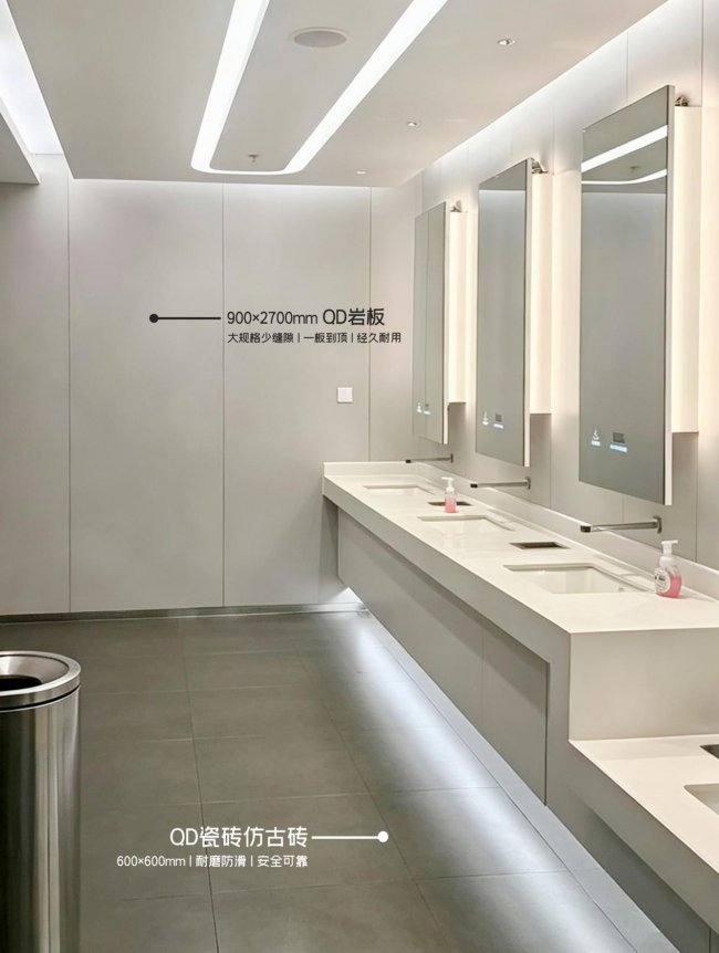 航站楼卫生间作为高频使用区域,对墙面材料的抗污、防潮、易清洁、耐冲击要求极高。项目选用QD 瓷砖900×2700mm规格岩板,以大尺寸规格实现少缝铺贴,视觉上简洁大气,更有效减少污渍藏匿;同时,岩板的防潮、防霉、抗污及耐酸碱特性,完美适配卫生间潮湿环境,长久保持墙面洁净如新,为机场空间的安全与卫生提供可靠保障。