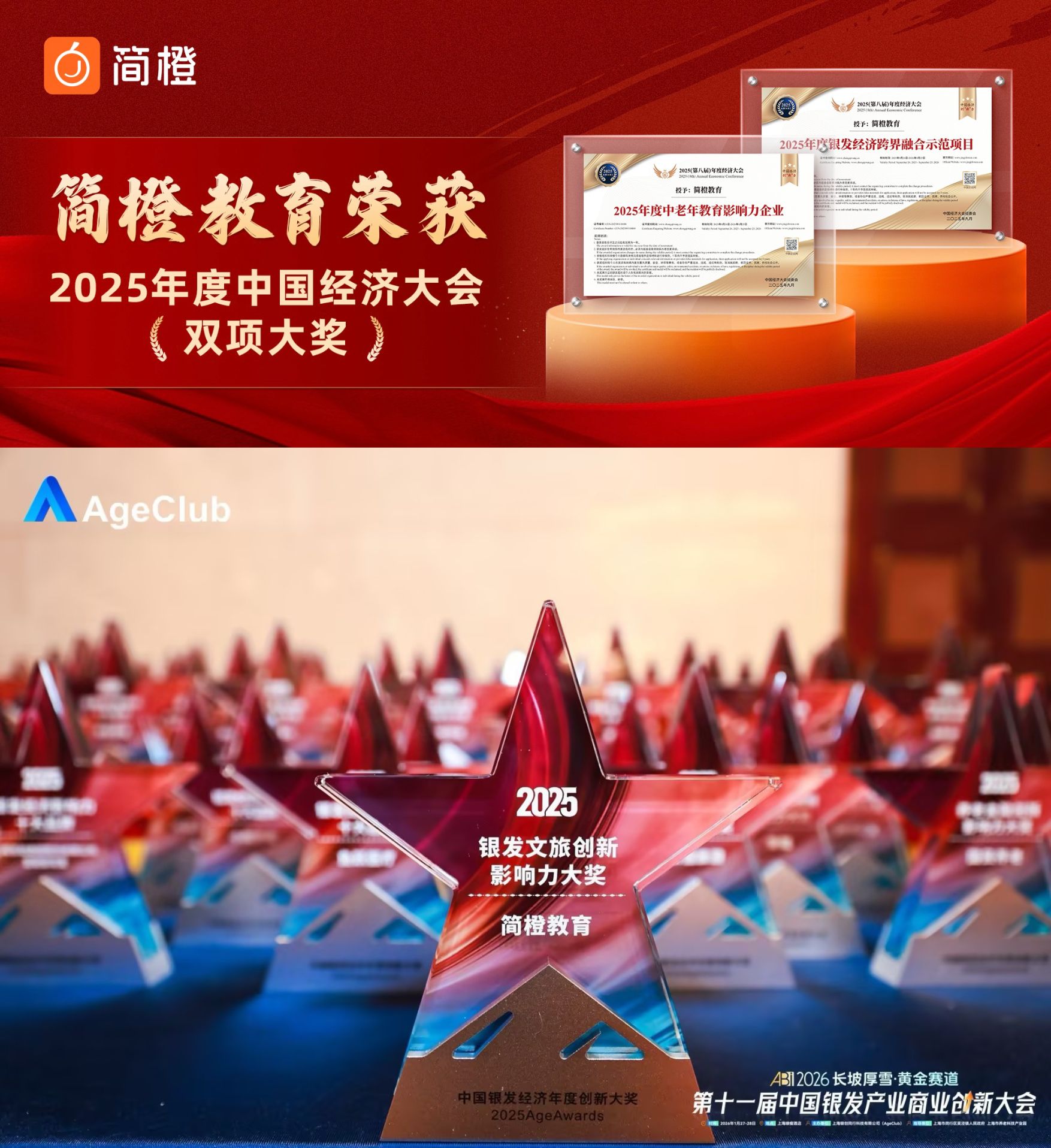 (简橙教育荣获中国经济大会“中老年教育影响力企业”与“银发经济跨界融合示范项目”两项大奖;简知文旅获评AgeAwards“2025银发文旅创新影响力大奖”)