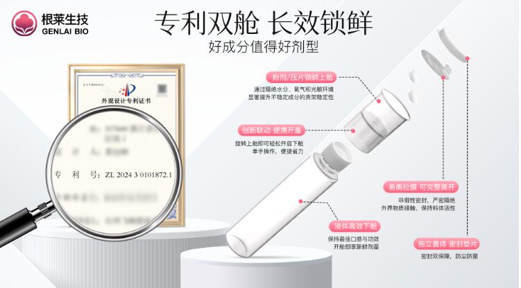 作为深耕营养健康食品代工领域多年的专业工厂,根莱生技已率先完成双舱饮剂型的技术储备与量产验证。根莱生技的研发团队通过专利包装设计及生产核心工艺,能够将油溶性成分与水溶性成分分别置于不同舱室,确保稳定性与生物利用度。同时,根莱生技在条袋、瓶饮、片剂、粉剂等传统剂型之外,也推出了卡片饮、瓶盖饮等创新形态,与双舱饮形成互补,为品牌方提供更丰富的产品矩阵选择。