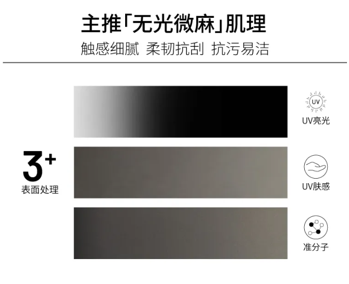 其中,系列主推「无光微麻」肌理,同时搭配Uv亮光、uv肤感、准分子等多种肌理选择,兼顾细腻触感与视觉层次,让每一块饰面板都兼具实用性与艺术性,适配不同商业空间的质感需求。