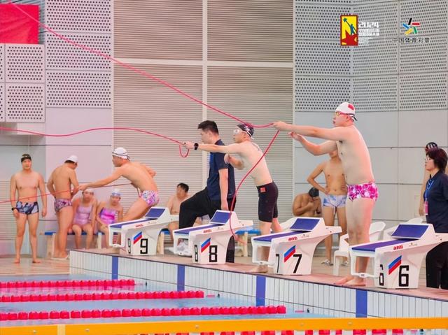 随后进行的是100米浮标救生项目。参赛选手携带救生浮标,听到 “出发信号”后从出发台起跳入水,游泳 50 米,触壁后在 5 米安全区内将救生浮标绕在假人胸部及双臂下,固定后拖带至终点。拖带过程中救生浮标斜跨于参赛选手肩部以保持绳索的充分伸展,最后以身体任何部位触池壁完成比赛。