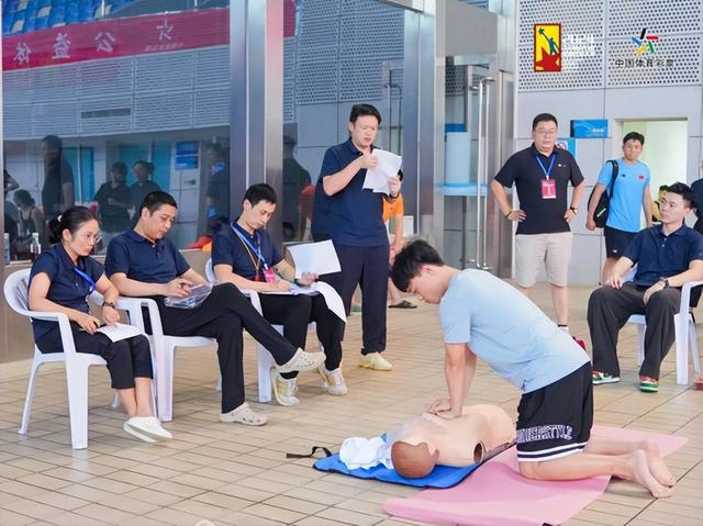 本次比赛分为理论知识、50米全能救生、100米浮标救生、心肺复苏及AED实操四个项目。