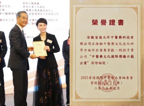 此次博览会上,德元升集团获颁“中医药文化国际传播示范企业”荣誉称号,全国政协副主席梁振英亲自为其颁发证书。这一荣誉不仅是对德元升过往实践的肯定,更彰显了其在推动中医药国际化进程中的责任与担当。佟鑫海表示,香港凭借与国际接轨的医药监管体系、深厚的中医药文化底蕴,成为中医药连接世界的“桥头堡”。未来,德元升将以此次博览会为契机,在坚守“辨证施治”“药食同源”核心优势的基础上,发力“中医理论国际化转化、临床经验数据化验证”,助力中医药深度融入全球健康治理体系。