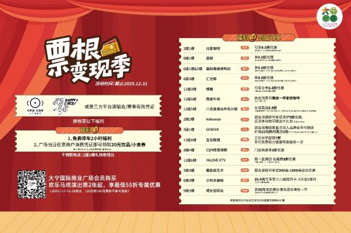 一张票根,让快乐加倍延续。即日起至12月31日,凭小不点大视界、上海马戏城欢乐马戏或第三方平台演唱会/赛事有效凭证,即可在大宁国际兑换专属商户福利;即日起-11月16日逢周末,广场积分商户单笔消费满218元并无感积分成功,即可获赠推送指定商户抵用券1张;即日起-11月20日,2座2楼礼坊合作商户单笔消费满额享以下优惠:满88元并无感积分成功即可获赠推送10元商户代金券、满288元领取上影CGV电影观摩券1张;11月27日-11月30日,广场积分商户单笔消费满288元并无感积分成功即可获赠推送指定商户抵用券1张;11月27日感恩节当天单笔消费满688元加赠100元商场通用券1张。(以上礼券均数量有限,赠完即止)