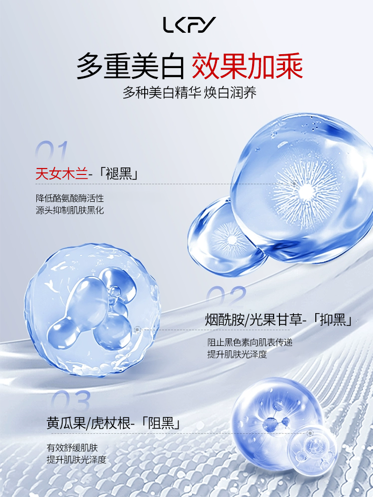 烟酰胺是美白明星成分,能抑制黑色素生成与转运、减少色斑,降低其颜色深度和面积,还具保湿作用。