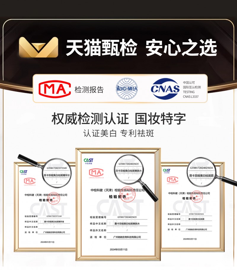 在选择祛斑产品时,产品的安全性和有效性是消费者最为关注的重点。露卡菲娅祛斑套装拥有国家唯一认证的祛斑资质,持有国妆特字证书与美白资质。这背后,是国家相关部门对其从研发、生产到质量检测等各个环节的严格审核与监督。一款产品能获得这样的认证,意味着它的安全性和有效性都得到了权威机构的认可,消费者可以放心使用。
