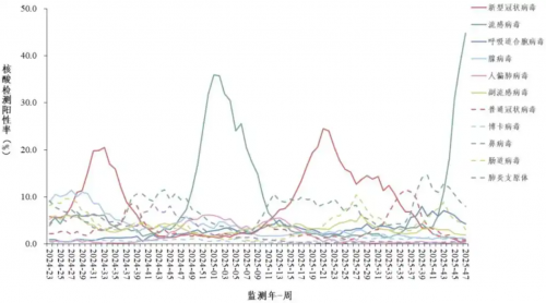 哨点医院门急诊流感样病例呼吸道样本病原体核酸检测阳性率每周变化趋势