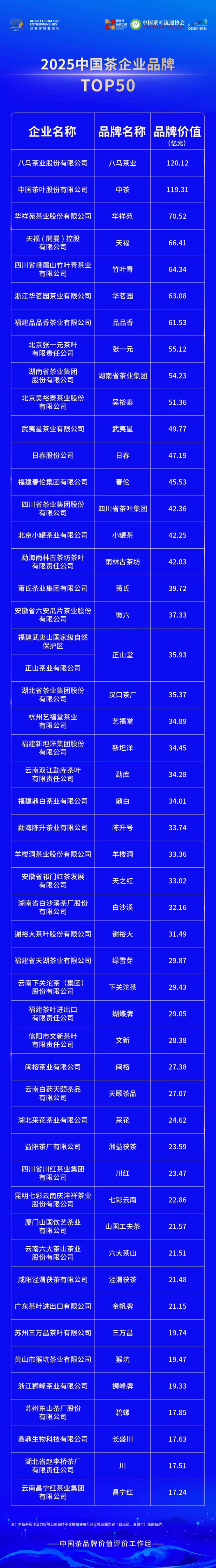 2025 年,中国茶产业在政策扶持与消费升级的双重驱动下,迈入 “量质齐升、价值重构” 的关键阶段。作为世界最大的茶叶生产国和消费国,中国茶行业正经历从规模扩张向品质效益转型的深刻变革,全产业链综合产值预计突破 1.15 万亿元,茶叶总产量有望达到 370 万吨,成为乡村振兴与消费升级的重要引擎。在此背景下,近日中国茶叶流通协会正式发布《2025 中国茶企业品牌 50》榜单,以品牌价值为核心,结合市场表现、产业布局等多维度指标,勾勒行业发展蓝图,为市场决策提供权威参考。