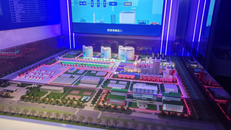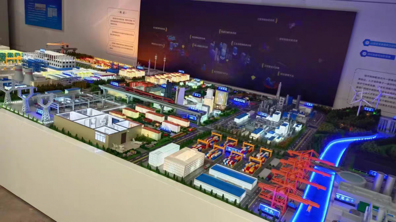 国家能源集团“绿港氢城”项目沙盘,此沙盘展示的是一个具体的区域性一体化项目。它紧密围绕沧州市的发展规划,有效整合了当地的化工基础、风光氢储一体化优势以及黄骅港的港口资源。沙盘描绘了旨在建设包含绿色零碳智慧港口、十万吨级绿氨化工基地、百万吨级绿氨贸易中心等在内的新能源大基地,突出了氢能在区域能源转型和产业升级中的关键作用。