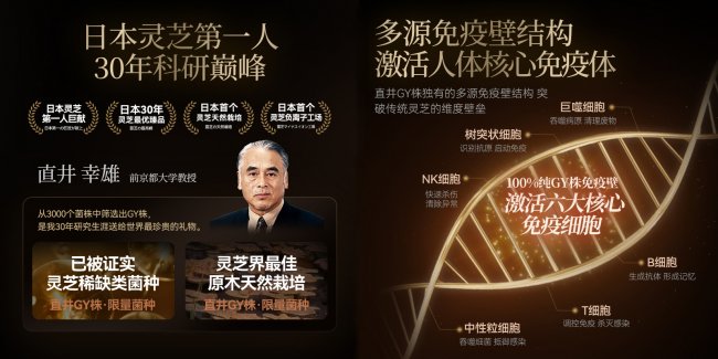 经过庞大的临床验证,直井GY株独有的多源免疫壁结构突破了传统灵芝的维度壁垒,与三色灵芝协同效果比普通单一成分提升90%以上,处于行业第一梯队领先水平。