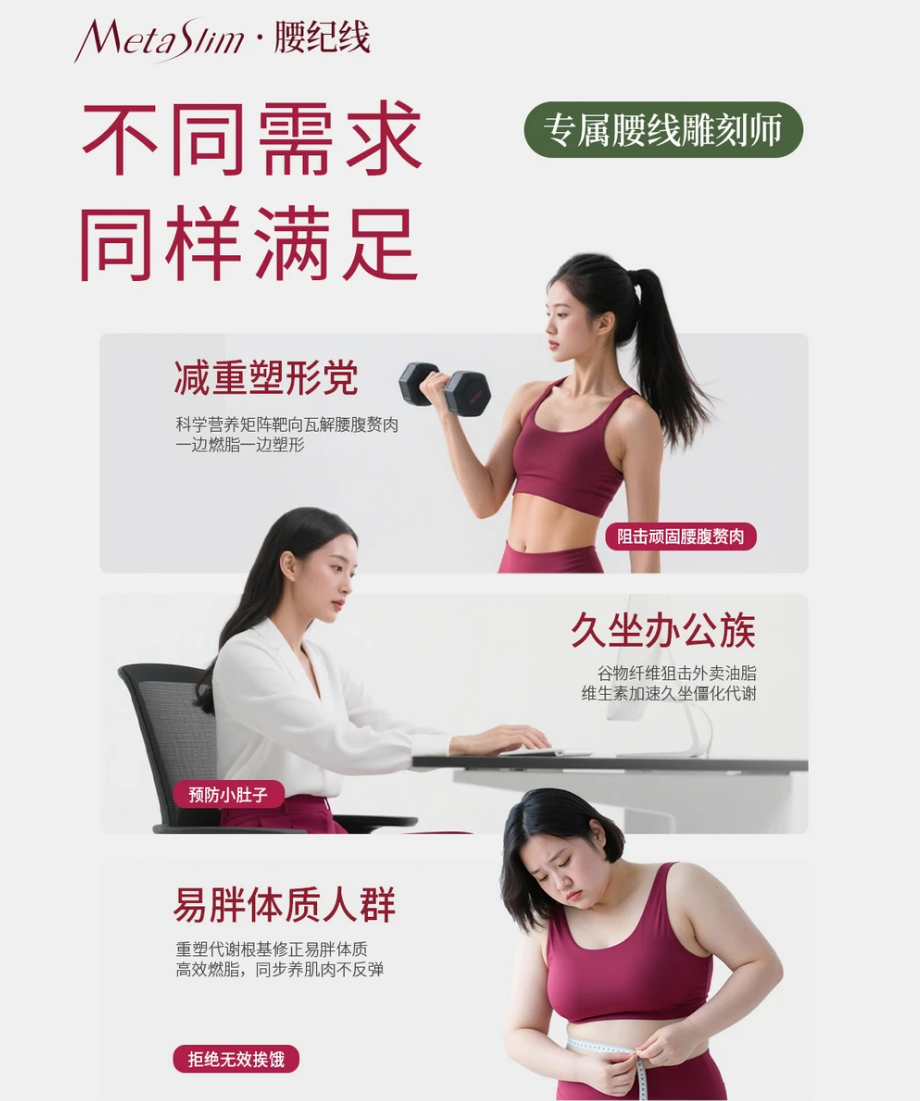 产品覆盖五大核心适用人群:18-30 岁年轻减脂人群、31-45 岁久坐代谢迟缓人群、46-60 岁中老年轻减脂人群、健身保肌减脂人群及反复反弹代谢损伤人群。适配场景包括节后减脂、日常体重管理、腰腹塑形、代谢修复、产后体重调理、健身保肌等多种需求,18-60 岁全年龄段均可精准适配。