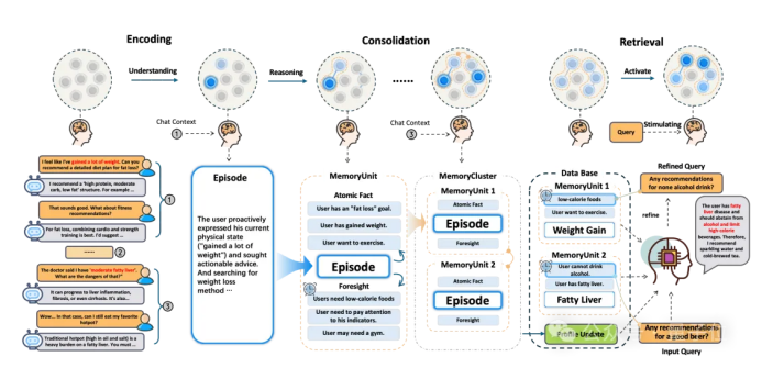 具体来讲,EverMemOS通过模拟人类记忆的形成并转化为计算框架,利用三阶段层层递进以实现大模型长期记忆的存储和提取:
